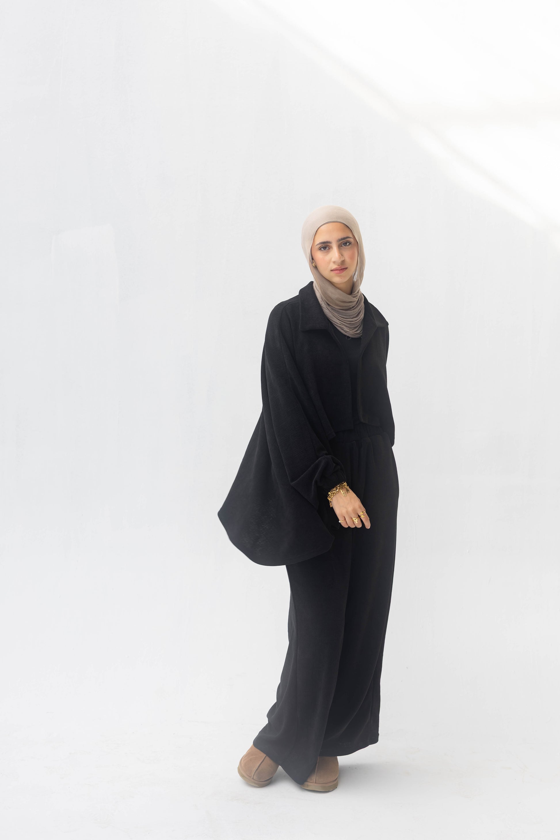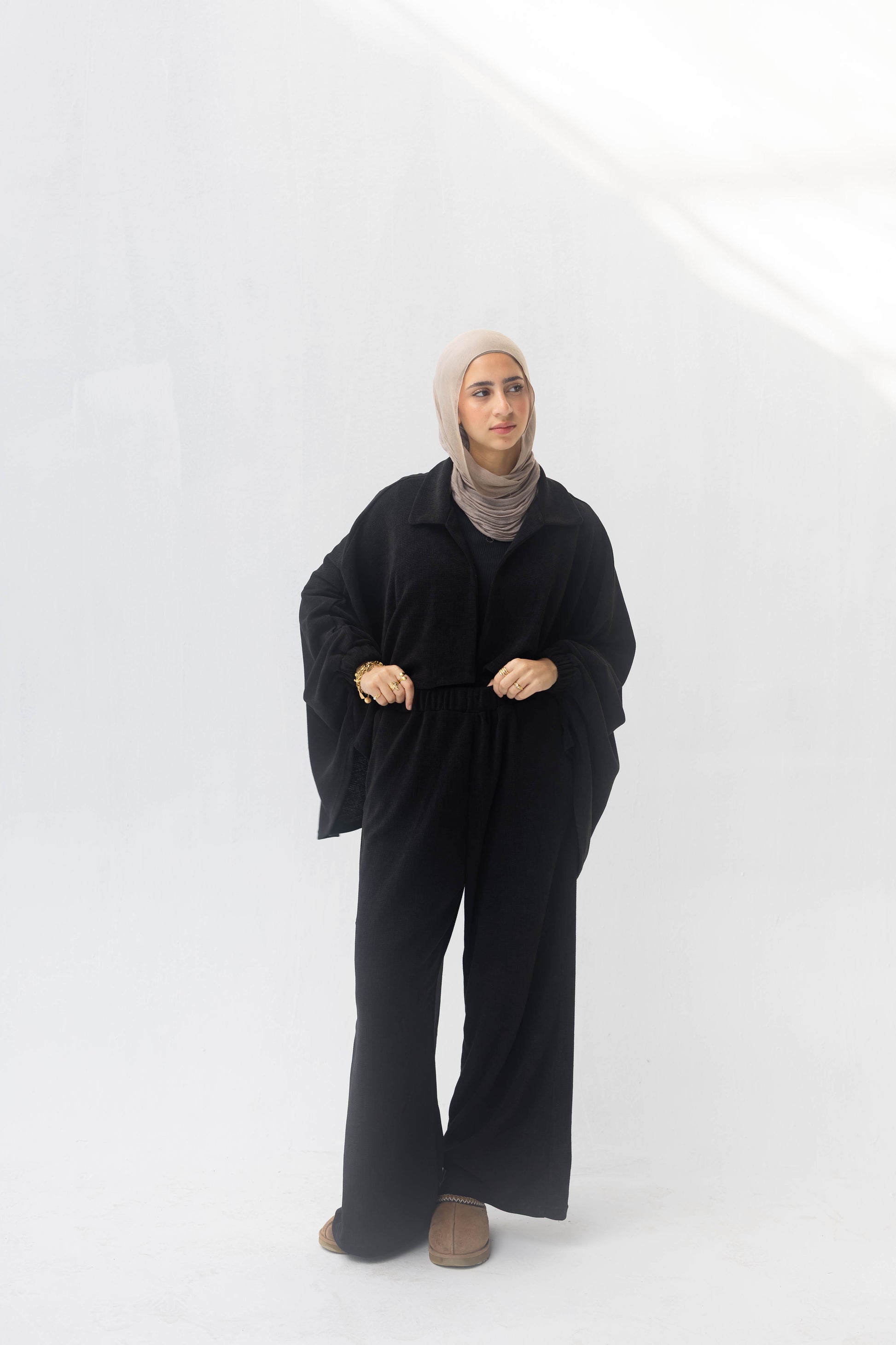 A super soft knit practical set designed for effortless everyday comfort. It features wide leg pants and a chic top with a unique cut; shorter at the front and longer at the back for a flattering, easygoing silhouette. Ultra comfortable, timeless, and perfect for on-the-go days.