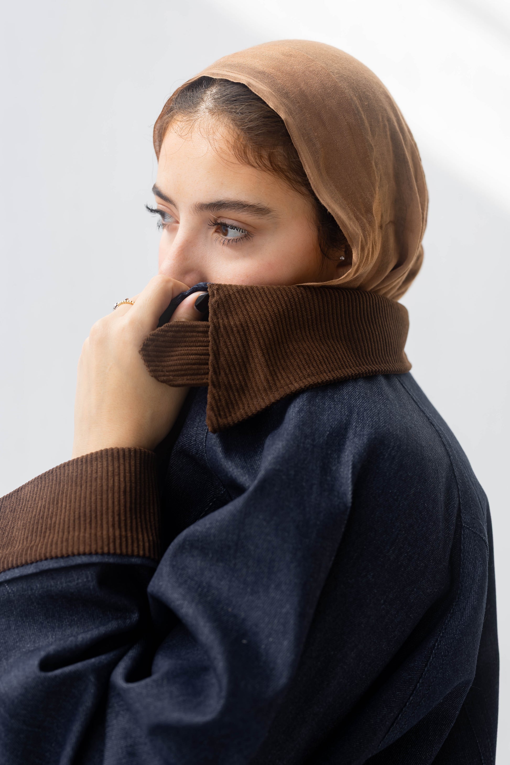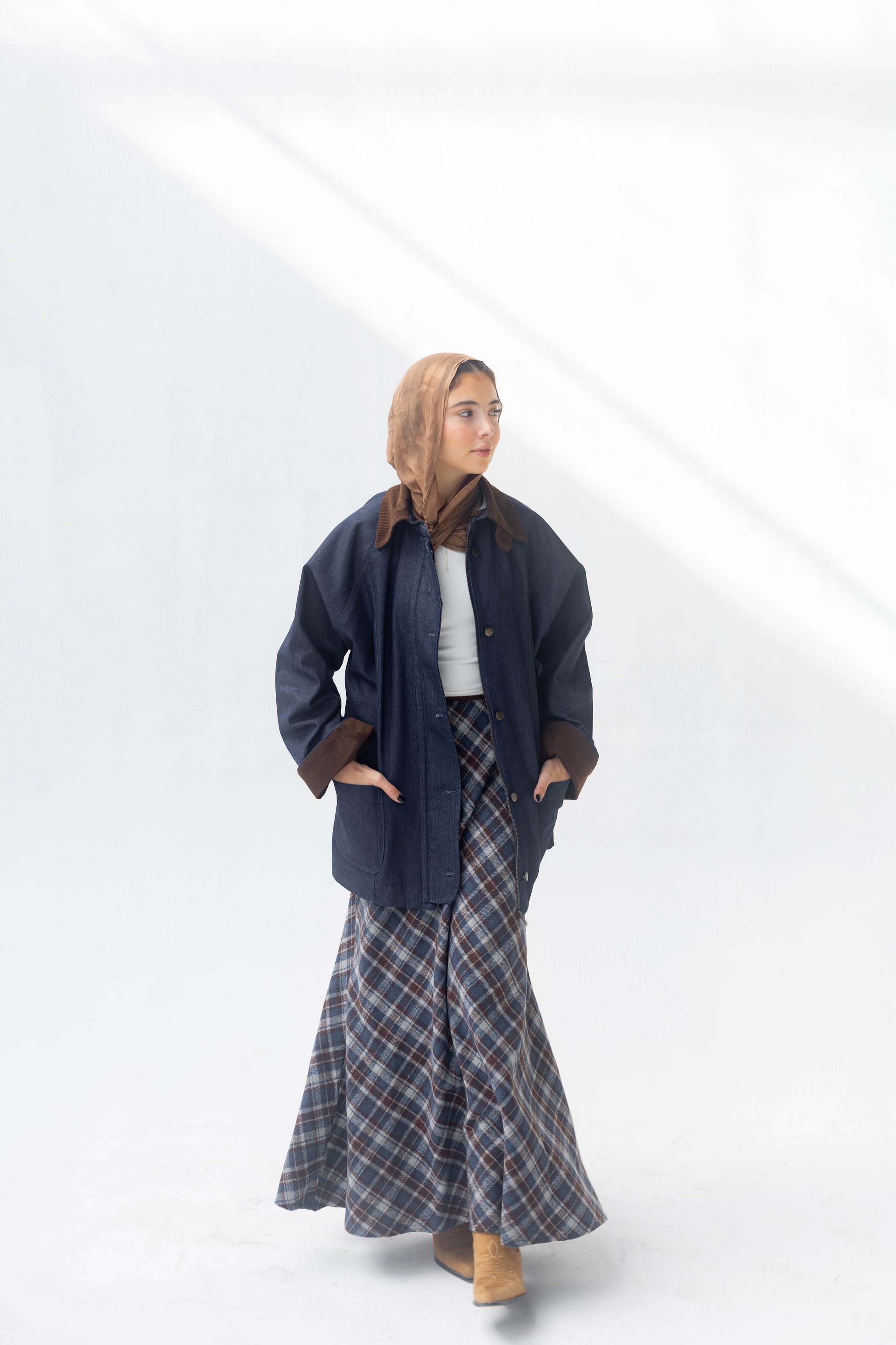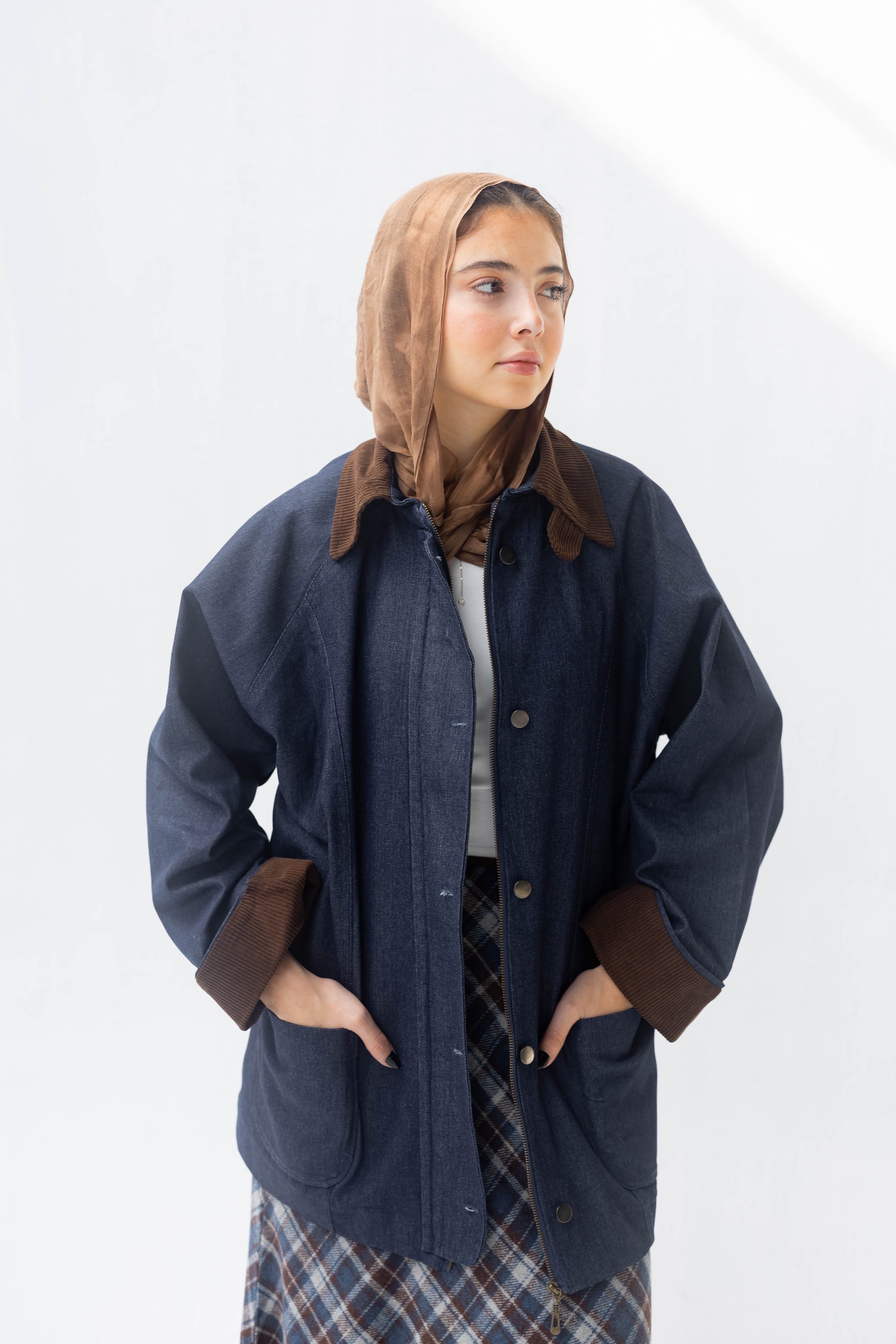 A modest oversized denim jacket with a unique twist; finished with a rich brown collar and matching cuffs for an elevated, elegant touch. Effortlessly stylish, distinctive, and the perfect statement layer for any winter look.